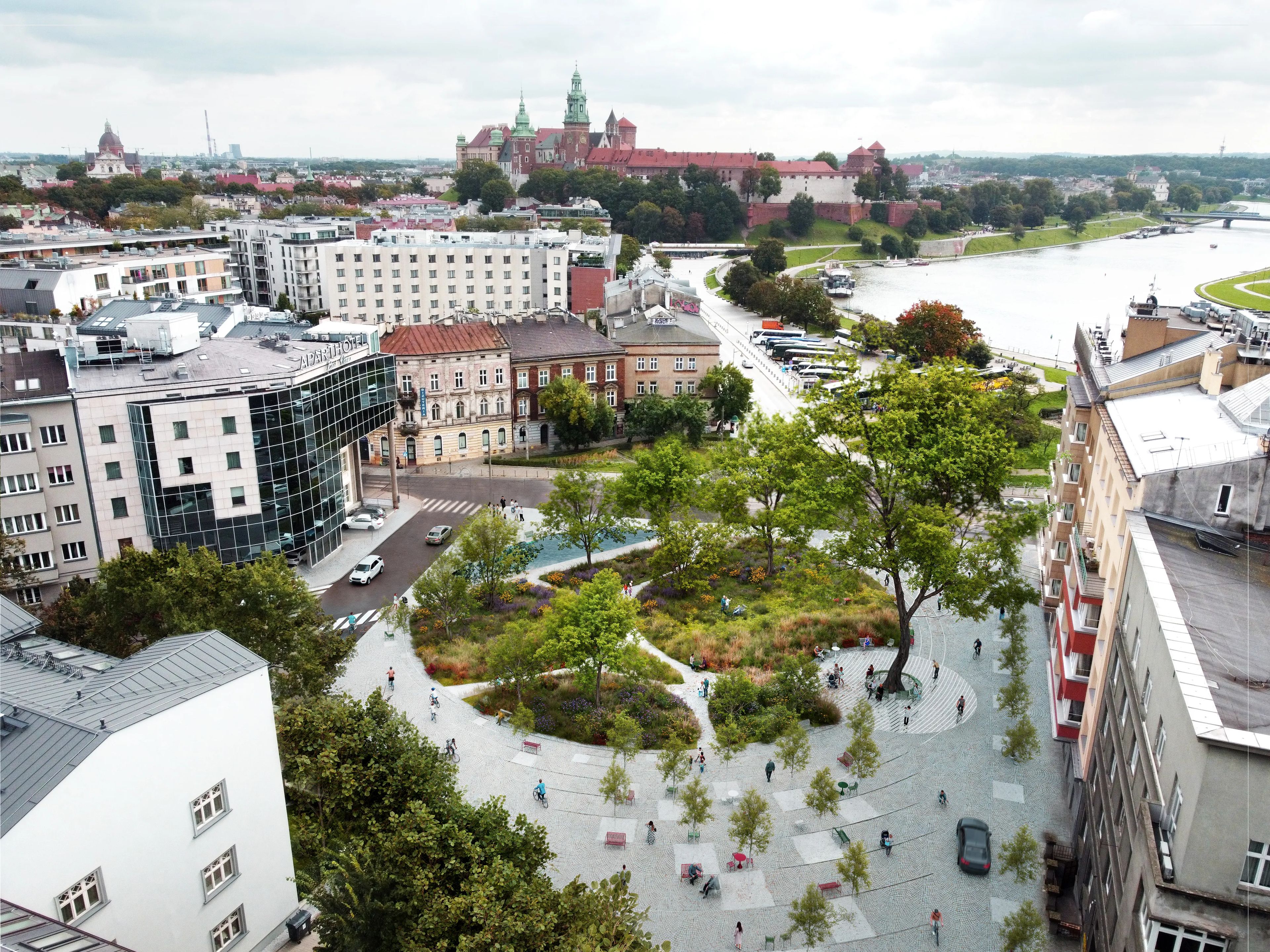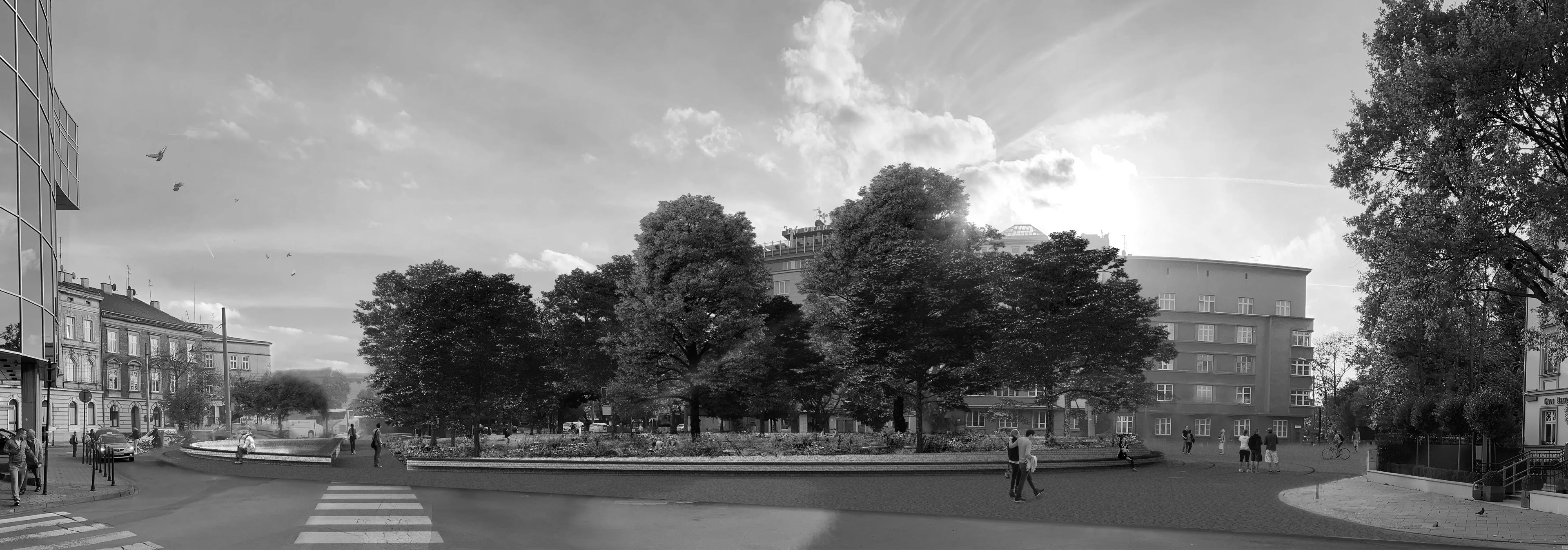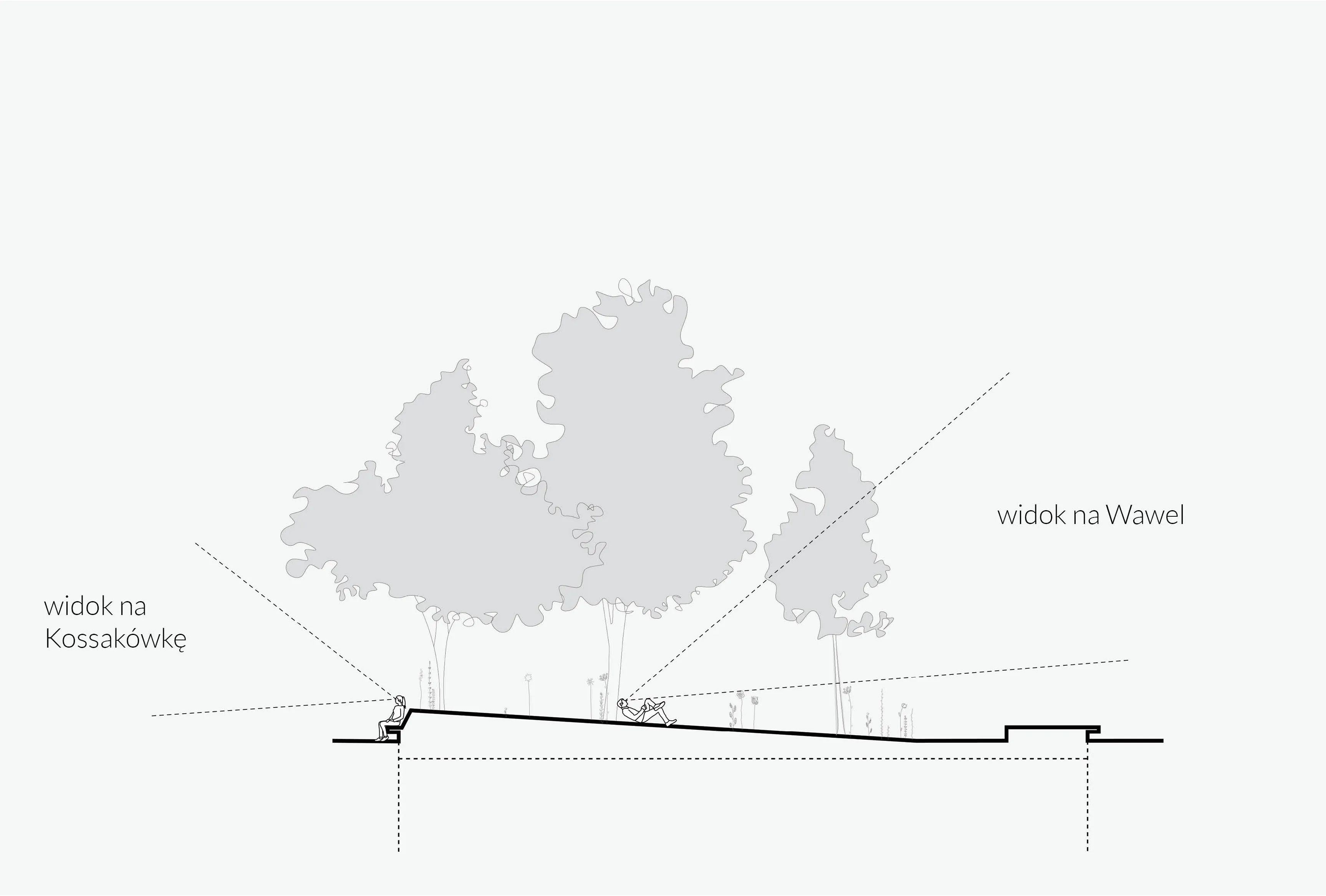Kossak Square should be a representative public space as an urban interior with an insight into the most representative axes and panoramic views of Krakow, including the Wawel, Vistula Boulevards and Retoryka street. Today, unfortunately, all this space is degraded, and the potential is completely wasted. Kossak Square requires a redefinition of its identity and character. An identity is built on respect for history, surroundings, and tradition. The square should become an extension of the Kossakówka Mansion - just as the villa used to be a bustling meeting place for Cracovians - today, this role should be played by the square. In Juliusz Kossak's paintings, we find not only the history of Poland but most of all the preservation of the landscape of Polish villages, meadows, and forests. It is the background that commemorates the increasingly rare and so deeply rooted panorama in Polish national consciousness. The design of Kossak Square creates a unique opportunity to restore this romantic landscape to the inhabitants of Krakow and to honor the painter's work. The composition consists of two main elements. The first is a circle cut by a path - an extension of the walking avenue of Retoryka Street. On one side there is a garden part that brings back memories of rural meadows. On the other side, where the Rudawa riverbed historically ran, there is a pond. The second element is a bench that surrounds and connects this whole. It constitutes the "City Salon" - a meeting place for the inhabitants, facing the historic buildings and the Wawel Castle towering over the city. The essence of the project is the meadows and fields of the rural landscape surrounded by the panorama of the Old Town.