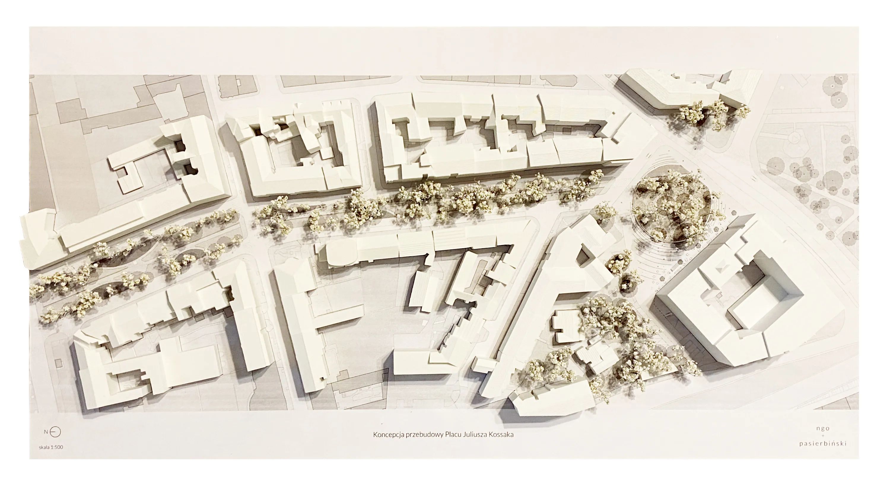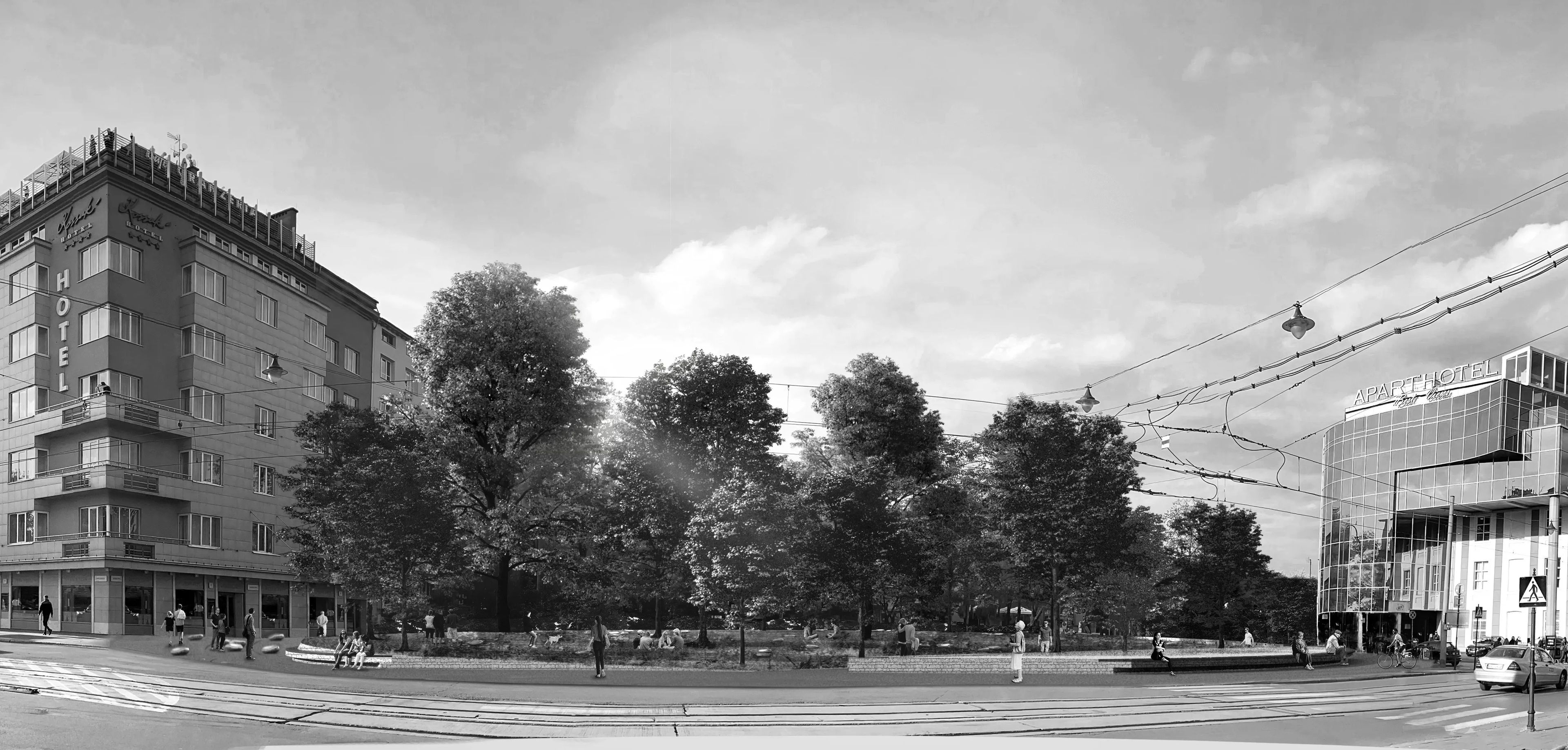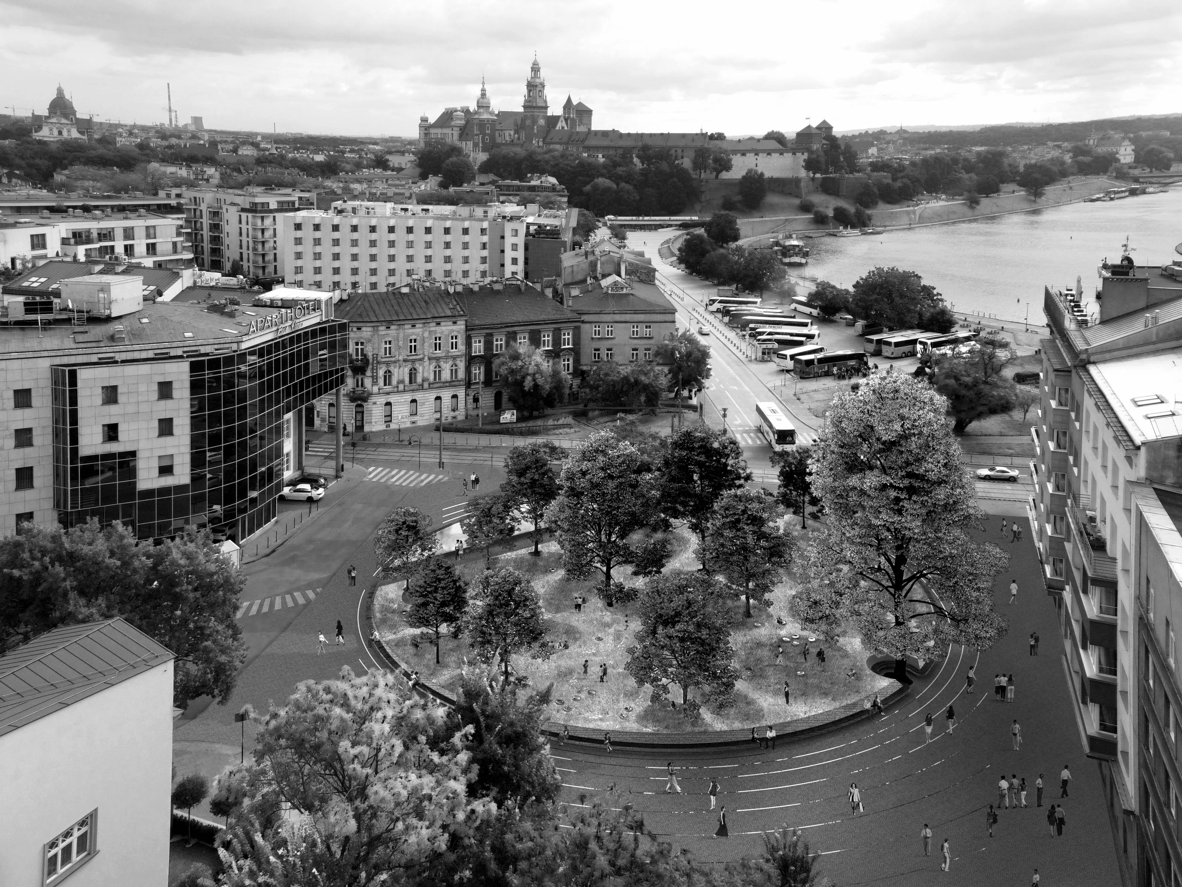 Kossak Square should be a representative public space as an urban interior with an insight into the most representative axes and panoramic views of Krakow, including the Wawel, Vistula Boulevards and Retoryka street. Today, unfortunately, all this space is degraded, and the potential is completely wasted. Kossak Square requires a redefinition of its identity and character. An identity is built on respect for history, surroundings, and tradition. The square should become an extension of the Kossakówka Mansion - just as the villa used to be a bustling meeting place for Cracovians - today, this role should be played by the square. In Juliusz Kossak's paintings, we find not only the history of Poland but most of all the preservation of the landscape of Polish villages, meadows, and forests. It is the background that commemorates the increasingly rare and so deeply rooted panorama in Polish national consciousness. The design of Kossak Square creates a unique opportunity to restore this romantic landscape to the inhabitants of Krakow and to honor the painter's work. The composition consists of two main elements. The first is a circle cut by a path - an extension of the walking avenue of Retoryka Street. On one side there is a garden part that brings back memories of rural meadows. On the other side, where the Rudawa riverbed historically ran, there is a pond. The second element is a bench that surrounds and connects this whole. It constitutes the "City Salon" - a meeting place for the inhabitants, facing the historic buildings and the Wawel Castle towering over the city. The essence of the project is the meadows and fields of the rural landscape surrounded by the panorama of the Old Town.