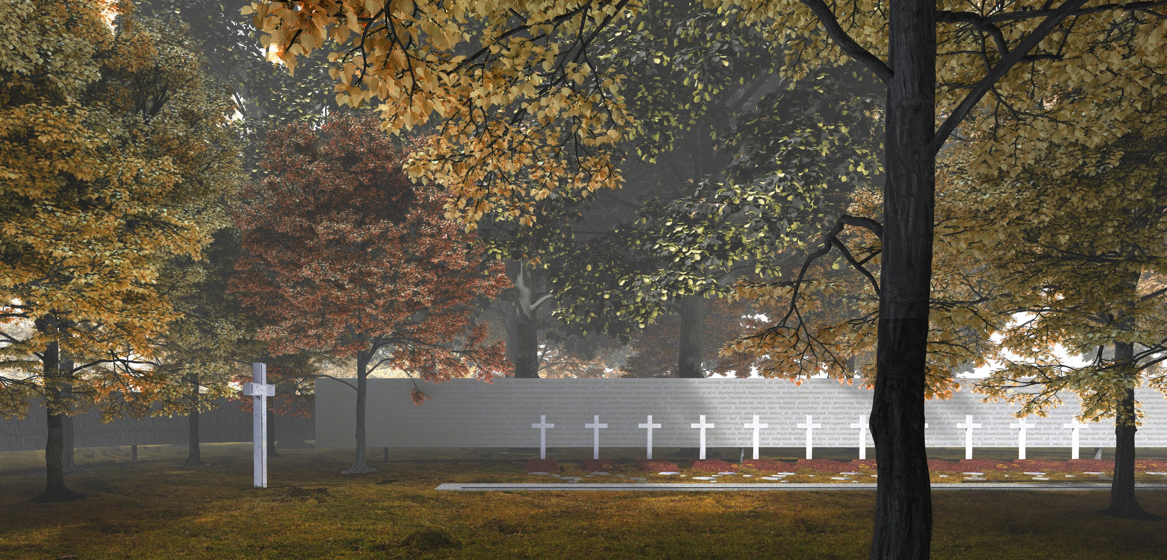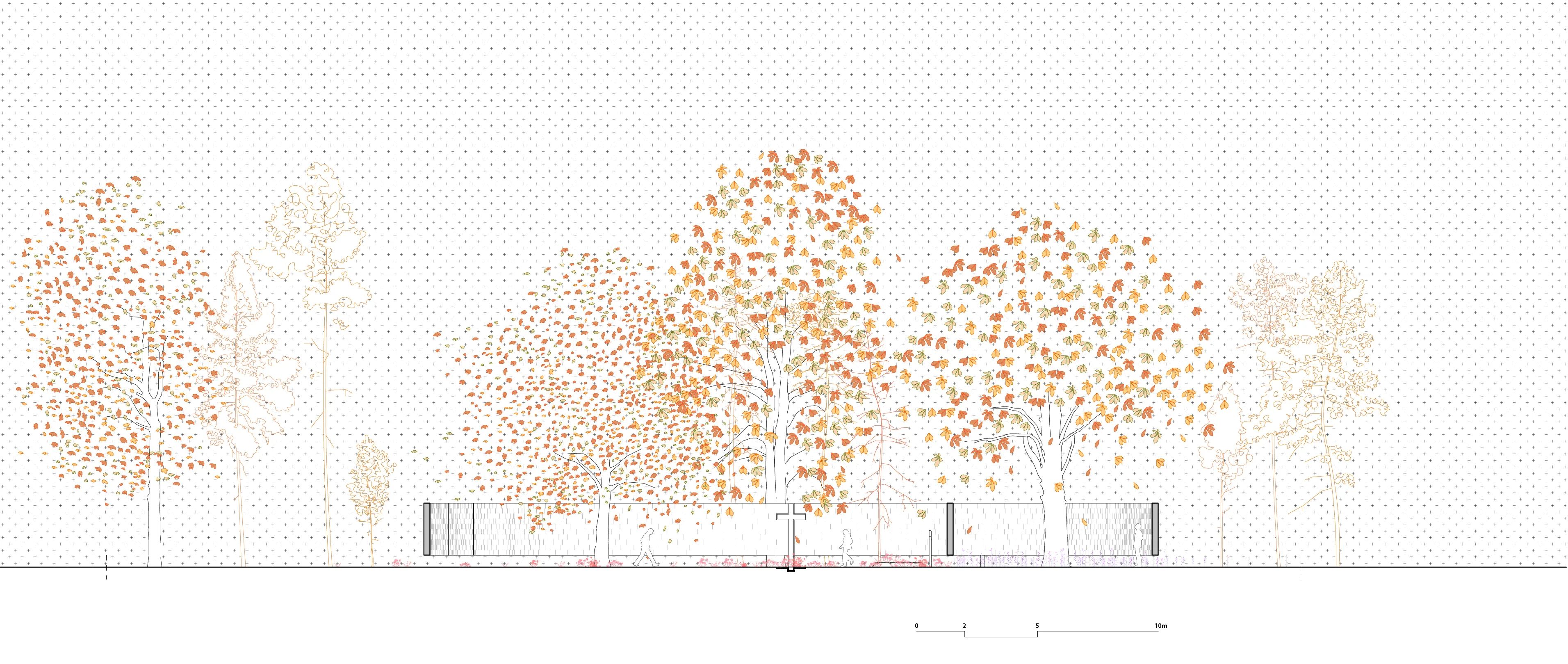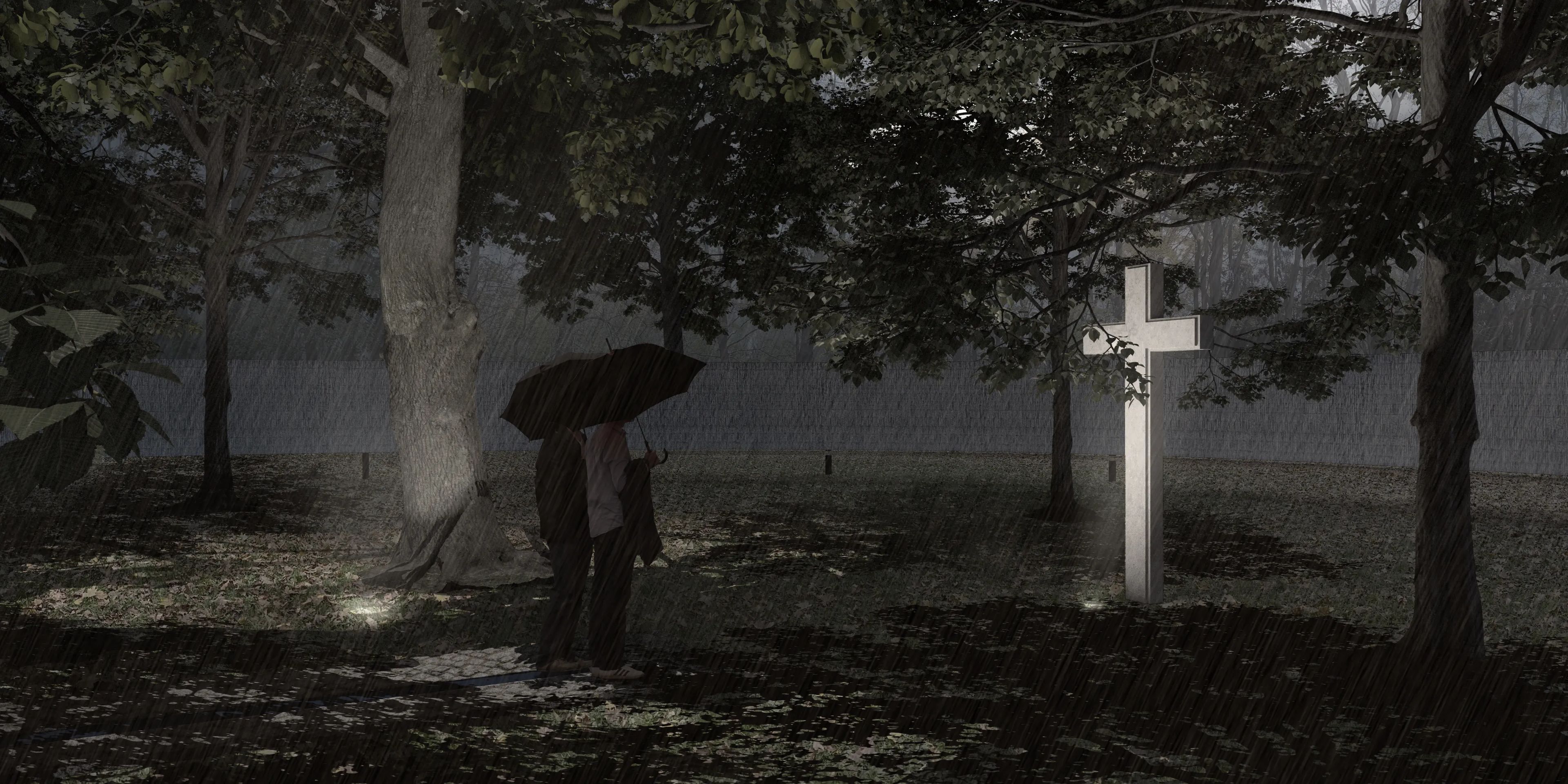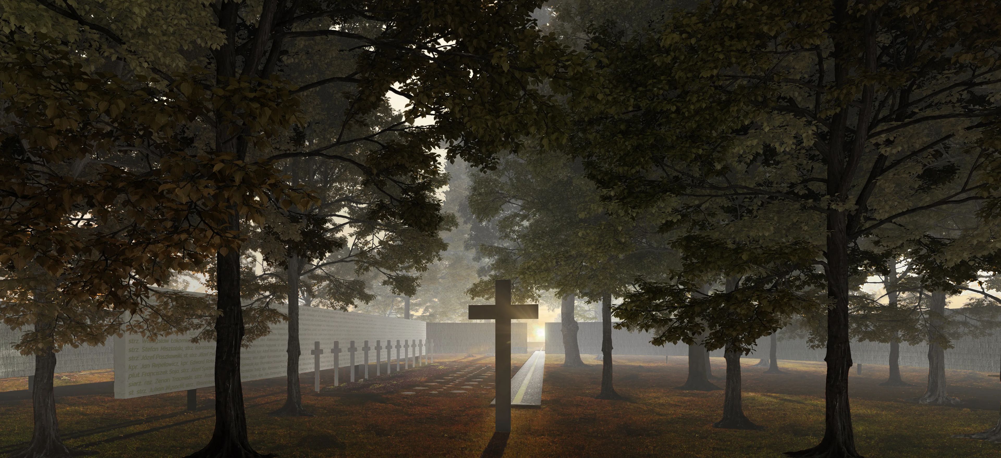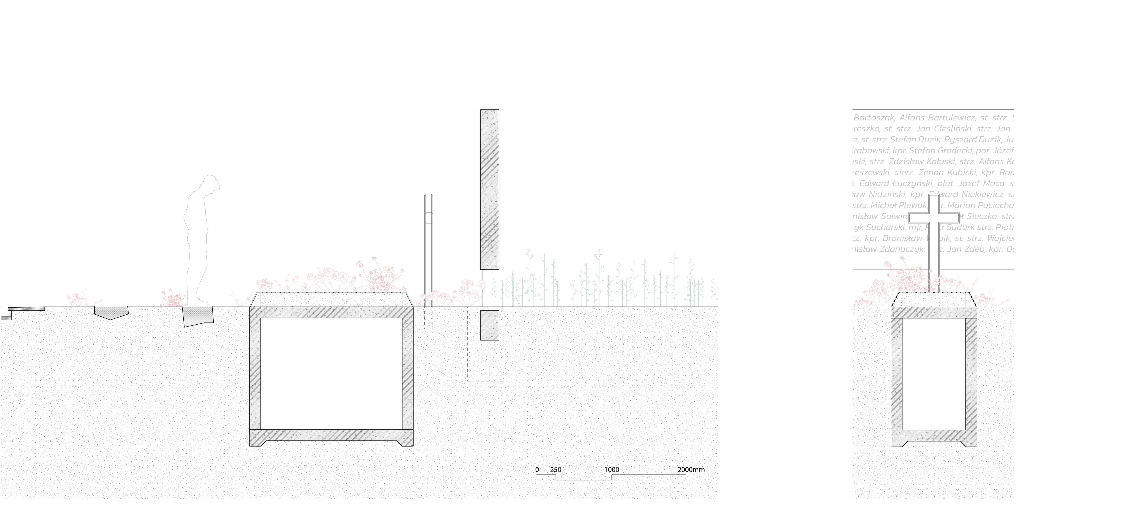 "If we came across a mound in the woods, six feet long and three feet wide, with the ground arranged in a pyramid, we would be in a gloomy mood and a voice within us would say," There is someone buried here. " This is Architecture. " – Adolf Loos The main idea of the cemetery is hortus conclusus (Latin: "enclosed garden") – contemplative room, garden in the garden, forest in the forest. A place disconnected from the world of noise, pedestrian traffic, and the smells of the port. An internal space where you can sit, walk, immerse yourself in your own thoughts, reach out back in time, watching flowers and trees. Hortus conclusus is closed all around and open to the sky and trees. Garden cemetery. Simple and austere, with earth graves with a brick cellar, similar to those built by friends of the fallen in 1939. It is dedicated to the memory of both fallen soldiers of the Polish Army and the entire unit taking part in the heroic defense of Westerplatte. The interior of the garden - Sacrum, the exterior - Profanum. Two spaces separated from each other by a wall, high enough to keep the interior hidden from the eyes of passers-by, but detached from the ground to reveal the secret to the curious. The elevation is an expression of respect for the topography of the historic battlefield, unchanged since 1939. The only mute witnesses to the history of heroic defense and the death of soldiers are the few trees that survived the artillery shelling, and during the battle provided cover and shelter for the fighting. The cemetery wall is a screen on which their shadows fall, emphasizing and exposing the presence of these silent guardians of history. The center of the composition is the cross of Captain Dąbrowski, symbolizing his own history of both defenses against the German aggressor and the communist invader. The main axis points towards sunrise on September 1, commemorating the place and time of the outbreak of World War II.
