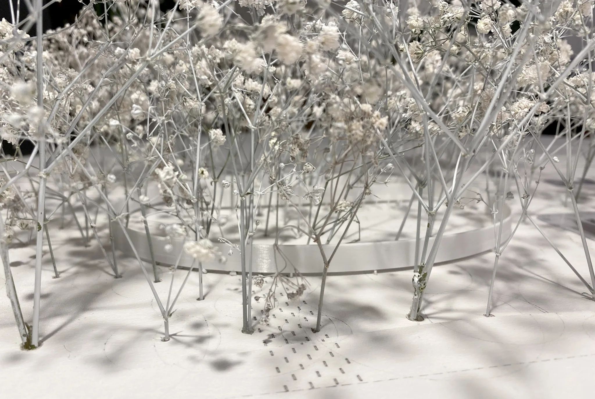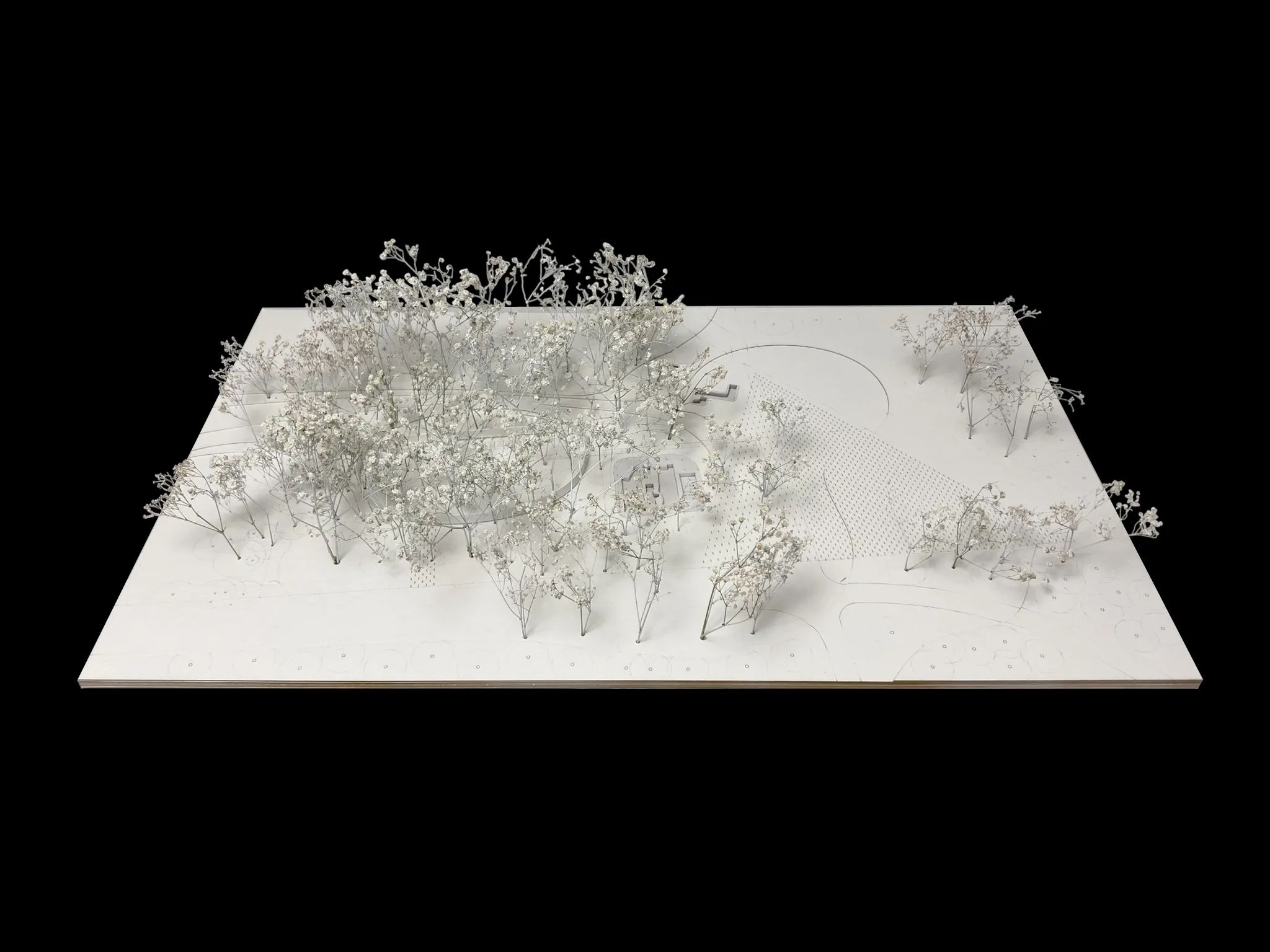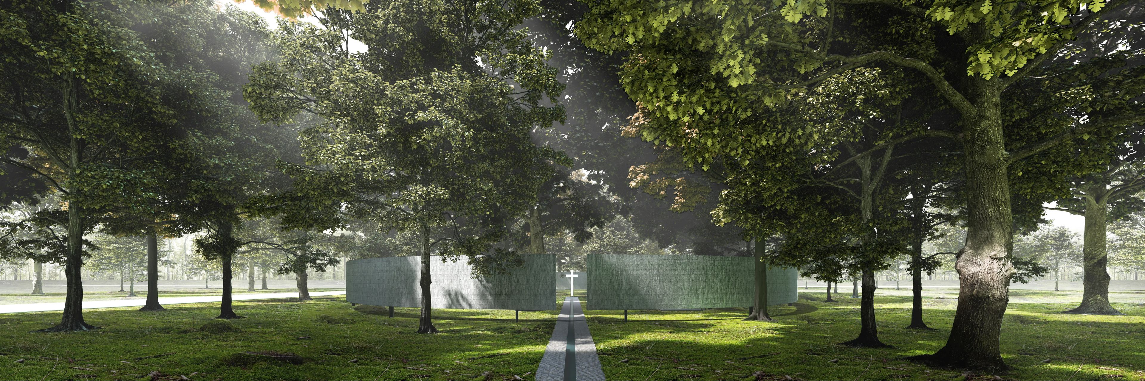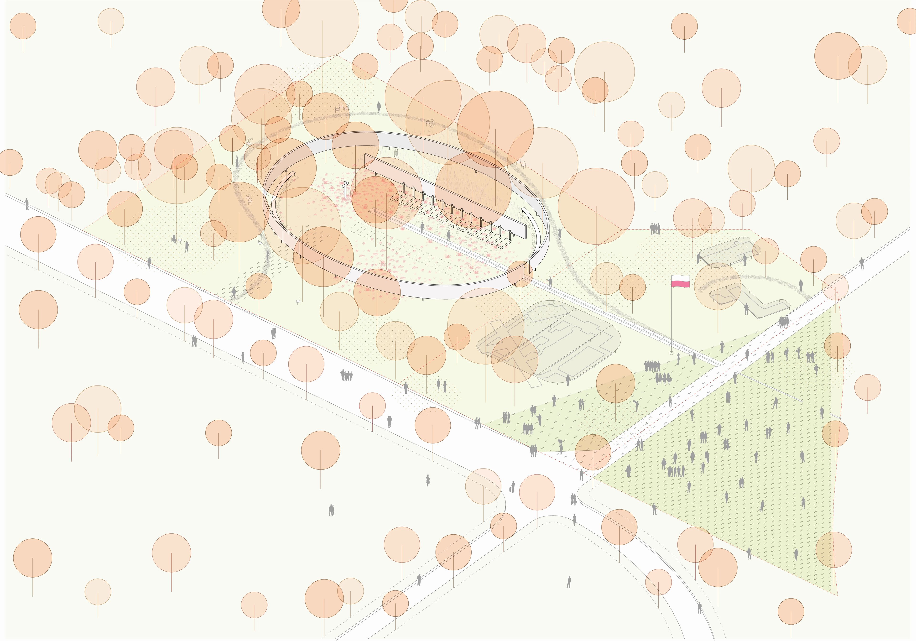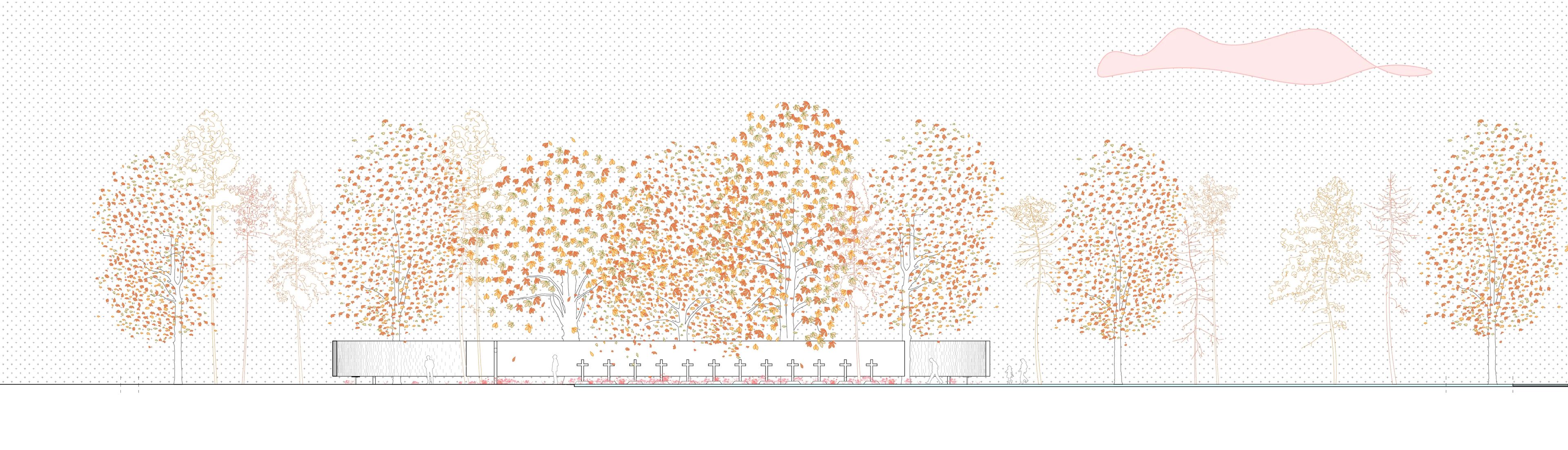 "If we came across a mound in the woods, six feet long and three feet wide, with the ground arranged in a pyramid, we would be in a gloomy mood and a voice within us would say," There is someone buried here. " This is Architecture. " – Adolf Loos The main idea of the cemetery is hortus conclusus (Latin: "enclosed garden") – contemplative room, garden in the garden, forest in the forest. A place disconnected from the world of noise, pedestrian traffic, and the smells of the port. An internal space where you can sit, walk, immerse yourself in your own thoughts, reach out back in time, watching flowers and trees. Hortus conclusus is closed all around and open to the sky and trees. Garden cemetery. Simple and austere, with earth graves with a brick cellar, similar to those built by friends of the fallen in 1939. It is dedicated to the memory of both fallen soldiers of the Polish Army and the entire unit taking part in the heroic defense of Westerplatte. The interior of the garden - Sacrum, the exterior - Profanum. Two spaces separated from each other by a wall, high enough to keep the interior hidden from the eyes of passers-by, but detached from the ground to reveal the secret to the curious. The elevation is an expression of respect for the topography of the historic battlefield, unchanged since 1939. The only mute witnesses to the history of heroic defense and the death of soldiers are the few trees that survived the artillery shelling, and during the battle provided cover and shelter for the fighting. The cemetery wall is a screen on which their shadows fall, emphasizing and exposing the presence of these silent guardians of history. The center of the composition is the cross of Captain Dąbrowski, symbolizing his own history of both defenses against the German aggressor and the communist invader. The main axis points towards sunrise on September 1, commemorating the place and time of the outbreak of World War II.