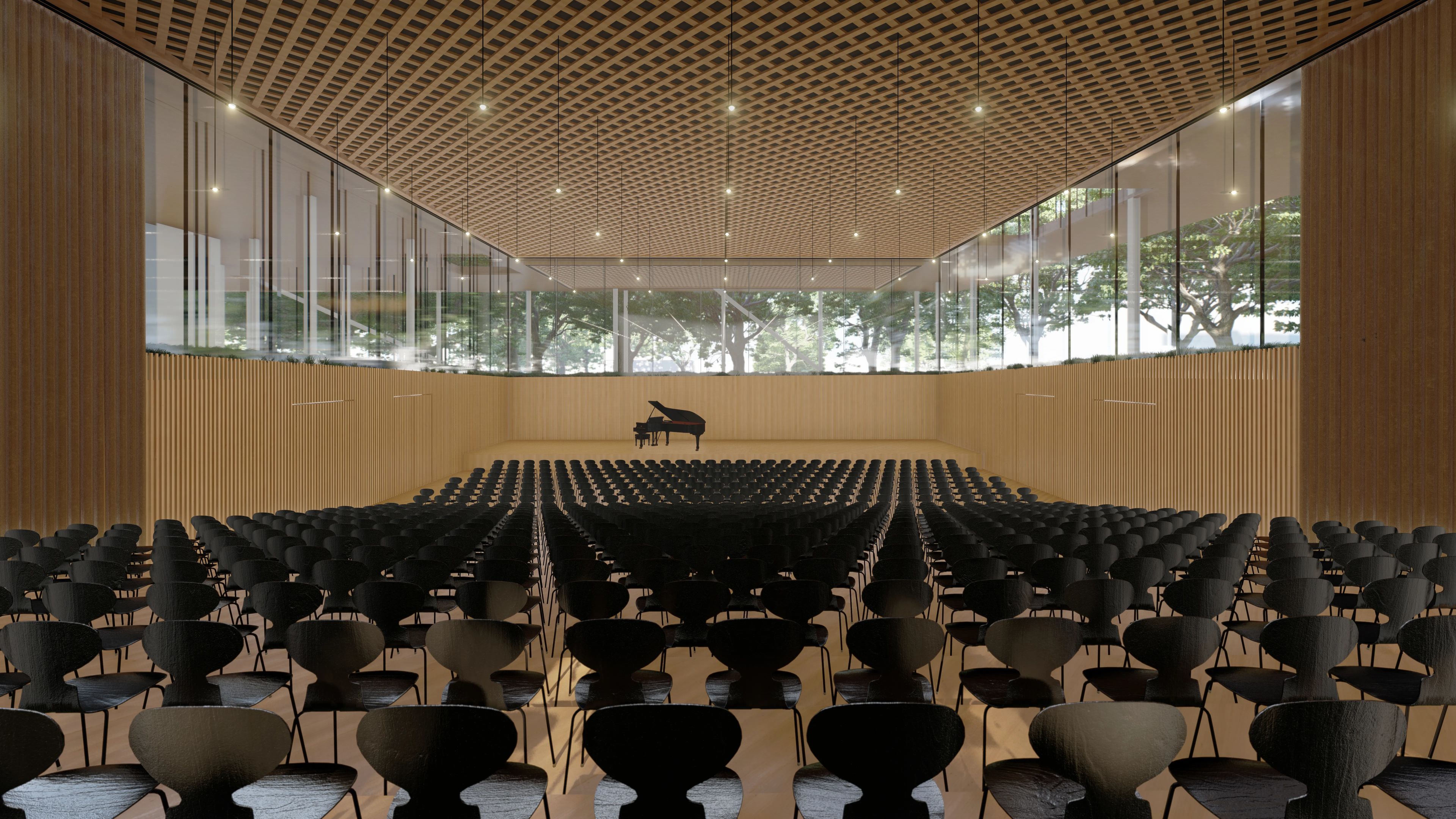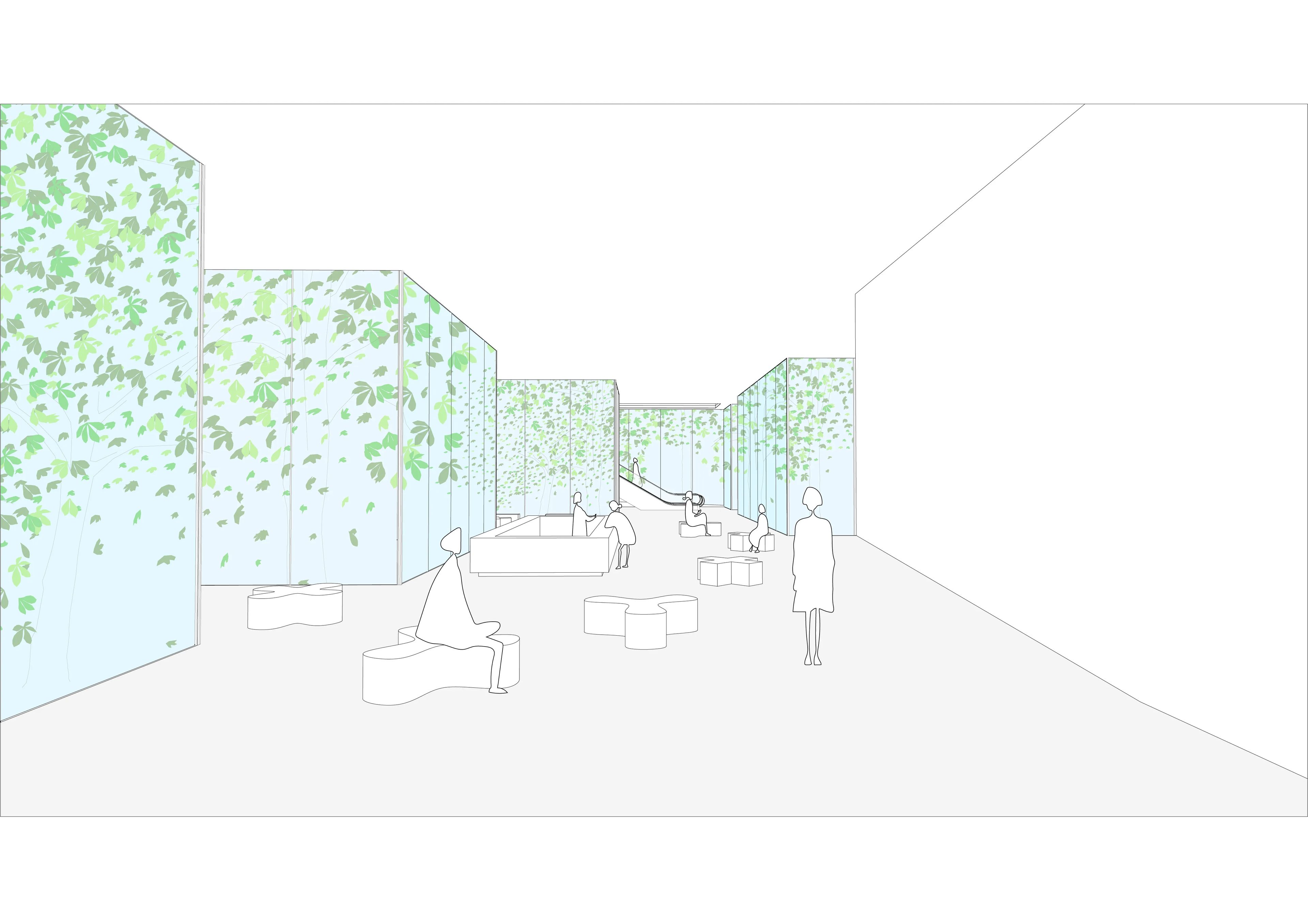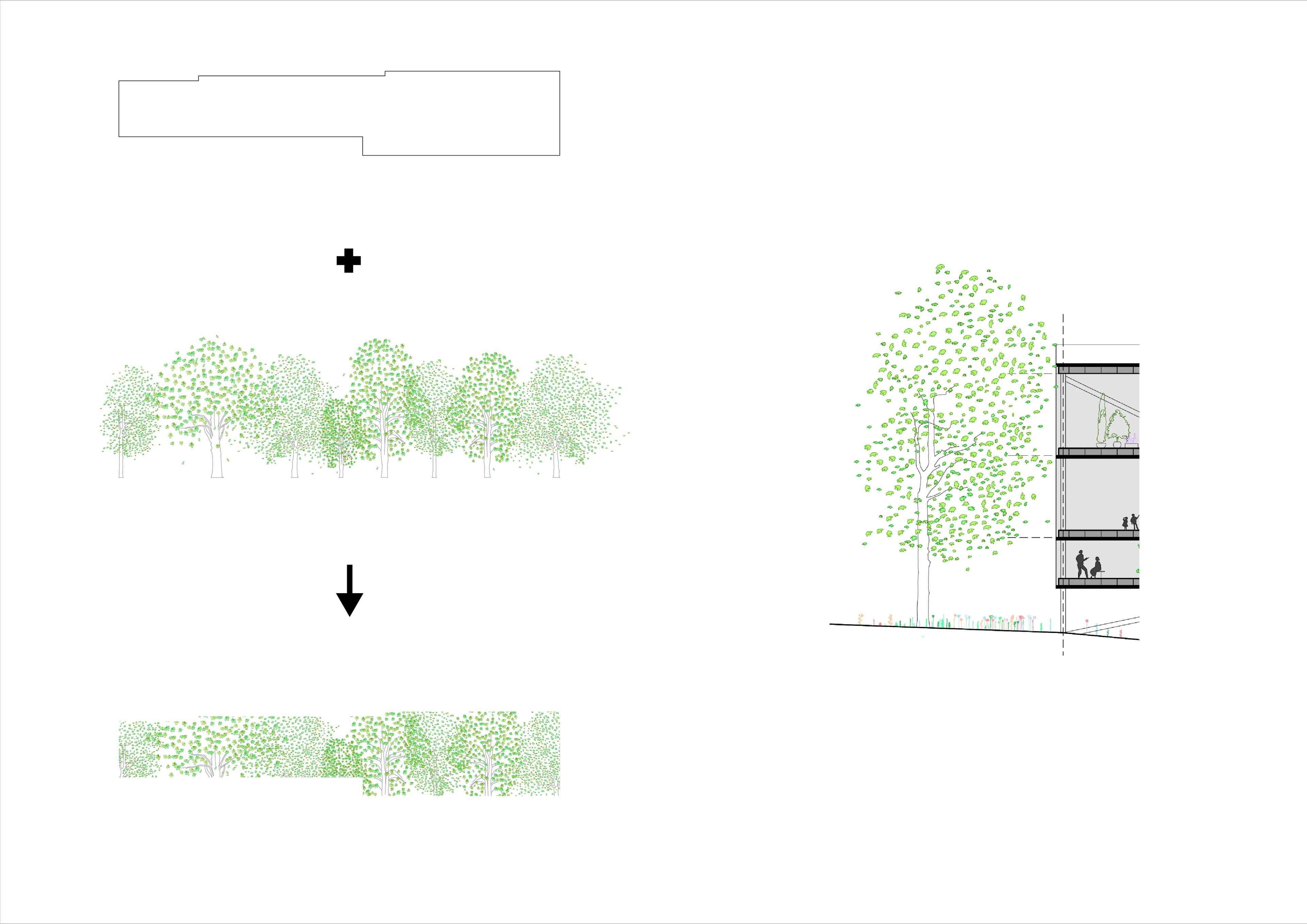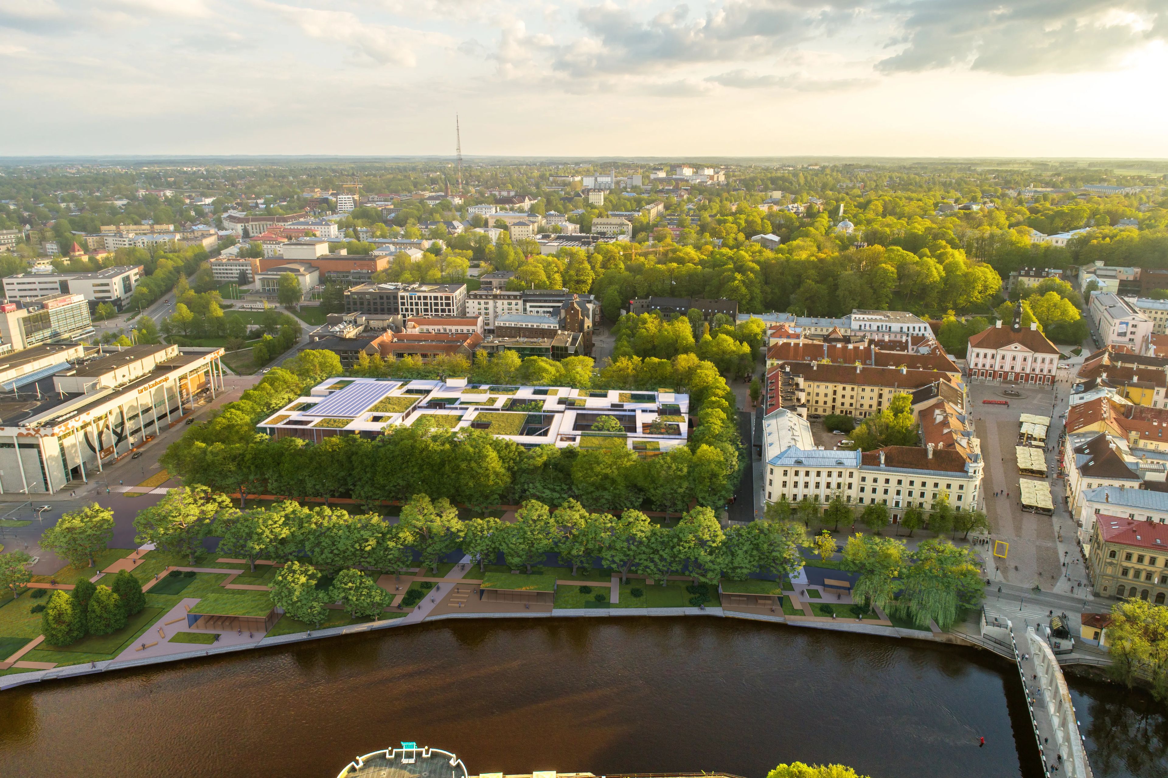 The Estonian word hiis refers to a sacred grove—places of deep cultural and spiritual significance where people once gathered for rituals, offerings, and seasonal celebrations. More than sites of worship, these groves were also centers of community life, where stories, food, and music were shared. The new cultural center in Tartu reinterprets the spirit of the hiis. Surrounded by dense rows of native trees, the building sits within a natural buffer that offers both privacy and seclusion. Architecture, light, and shadow echo the atmosphere of the groves, creating spaces that invite participation rather than passive contemplation. Like wandering through a forest, visitors move through the center in a fluid sequence of spaces—places to study, perform, play, listen, and work. The design moves away from conventional exhibition halls and classrooms, blending instead with its natural surroundings to foster community and connection. The site itself shaped the project. Old, densely planted trees outline the edges of the block, recalling where buildings once stood. Instead of erasing this natural facade, the design preserves it—placing the new structure at the heart of the site. The trees form an architectural street edge, their generous canopies filtering sunlight and shaping outdoor rooms. Inside and outside merge seamlessly, making the cultural center both a building and a grove: a contemporary hiis for all.